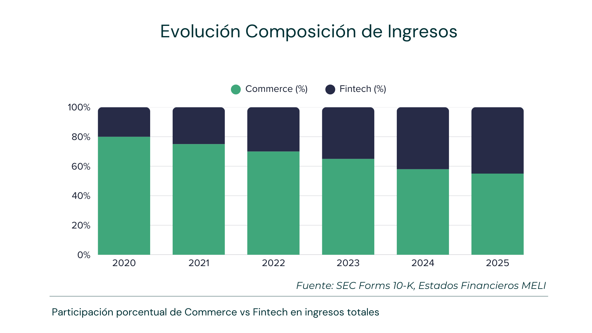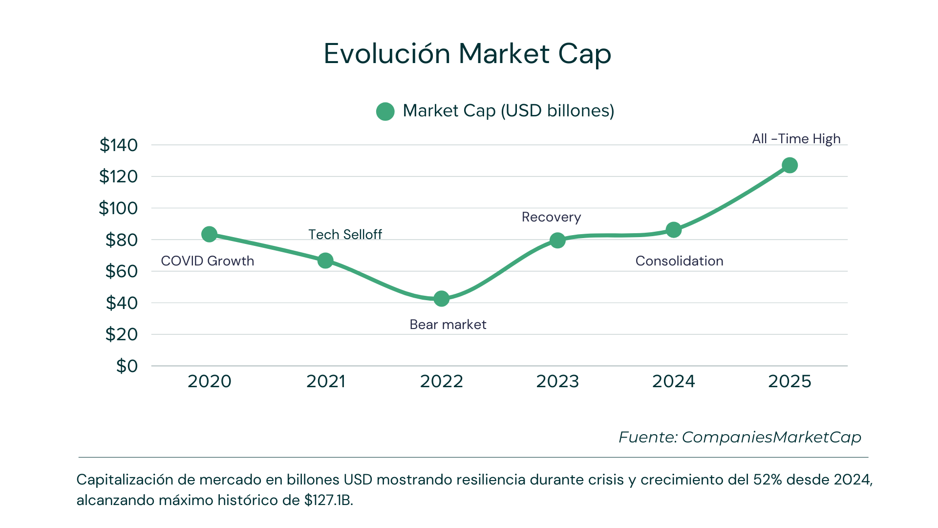 La valoración actual de $124 mil millones posiciona a Mercado Libre como la empresa más valiosa de América Latina, con el brazo fintech contribuyendo aproximadamente $32.7 mil millones (33.4%) de la capitalización total. Mercado Libre no solo sobrevivió a Amazon: redefinió completamente las reglas de competencia. Su ecosistema integrado —marketplace, fintech, logística y publicidad— genera efectos de red imposibles de replicar. Cada transacción en el marketplace alimenta datos para Mercado Pago, cada préstamo otorgado aumenta la retención de usuarios, cada envío exitoso fortalece la lealtad del cliente.
